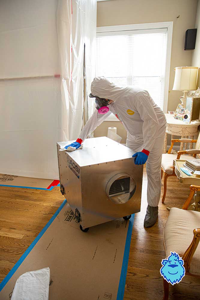 Whatever your mold remediation plan looks like, it will usually begin with PPE (protective gear) for our team (often looking like an astronaut), and then PPE for your building (sometimes using containment walls and air scrubbers; creating negative pressure to control air flow). These steps help keep the mold remediation cost down overall, because you’re limiting the spread of mold spores to unaffected environments in the property.